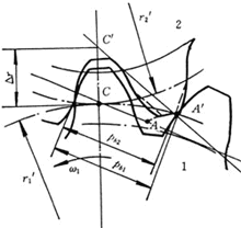 a、齒輪制造及裝配的誤差,輪齒受載后產(chǎn)生的彈性形,將使嚙合輪齒的法向齒距Pb1與Pb2不相等(見(jiàn)左圖),因而輪齒就不能正確嚙合傳動(dòng),齒輪傳動(dòng)瞬時(shí)傳動(dòng)比就不是定值,就會(huì)產(chǎn)生角加速度,于是引起動(dòng)載荷或沖擊。 |