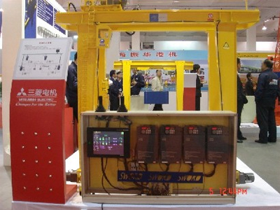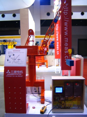 在2008年4月舉行的“第二屆中國(上海)國際起重機(jī)械及配件展覽會(huì)”上,三菱電機(jī)首次向眾人展示了起重行業(yè)的綜合解決方案。6套色彩鮮艷并按真實(shí)起重機(jī)等比縮小的模型,演示著6項(xiàng)各不相同的控制功能,吸引了觀眾的目光。功能簡介如下: