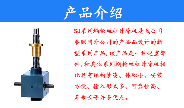 SJ系列蝸輪絲杠升降機是我公司參照國外公司的產(chǎn)品而設(shè)計的新型系列產(chǎn)品,該產(chǎn)品是一種起重部件,和其他系列蝸輪絲杠升降機相比具有結(jié)構(gòu)緊湊、體積小、安裝方便、輸入形式多、可靠性高、壽命長等許多優(yōu)點。