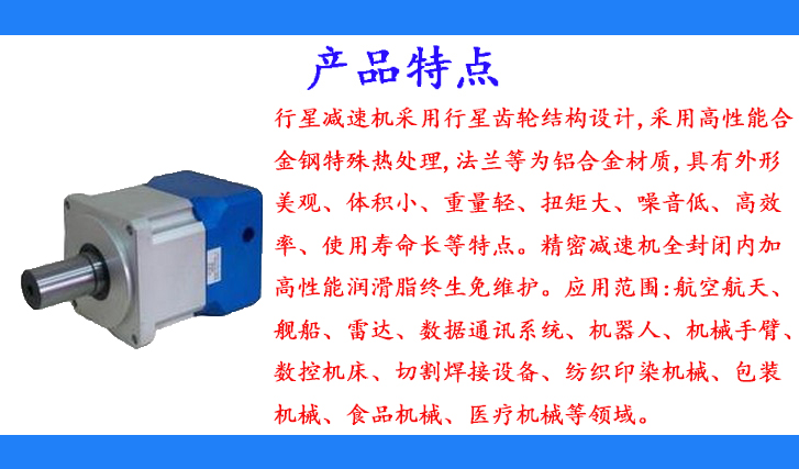 行星減速機采用行星齒輪結(jié)構(gòu)設(shè)計,采用高性能合金鋼特殊熱處理,法蘭等為鋁合金材質(zhì),具有外形美觀、體積小、重量輕、扭矩大、噪音低、高效率、使用壽命長等特點。精密減速機全封閉內(nèi)加高性能潤滑脂終生免維護。