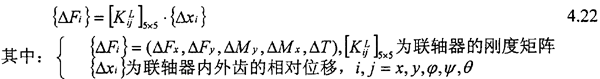 因此通過聯(lián)軸器的剛度[KijL]5×5(由第三章求得)把動態(tài)力和力矩表示成內(nèi)外齒相對位移的顯函數(shù),從而得到齒輪聯(lián)軸器連接軸系的彎曲和扭轉(zhuǎn)振動方程。