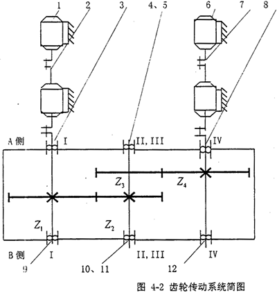 軋機(jī)減速機(jī)是軋鋼廠的動(dòng)力傳輸裝置,它起到減速(粗軋時(shí))和增速(精軋時(shí))的作用。它一般由兩對(duì)斜齒輪、若干個(gè)調(diào)心滾子軸承和箱體組成。圖4-2是減速機(jī)機(jī)組的機(jī)構(gòu)運(yùn)動(dòng)簡圖,在該圖中,軸III在軸II的正下方。