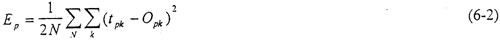 前饋網(wǎng)絡(luò)的訓(xùn)練學(xué)習(xí)是一種監(jiān)督學(xué)習(xí),而監(jiān)督學(xué)習(xí)的范例要求每一個(gè)輸入模式矢量與表示所期望的輸出模式矢量必須配對(duì)。一般說來,網(wǎng)絡(luò)輸出值{OPK}與期望的輸出值{tPK}是不相等的。對(duì)每一個(gè)輸入模式的模式樣本,其平方誤差