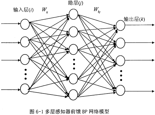 BP算法即是誤差反傳訓(xùn)練算法,它是一種有導(dǎo)師的訓(xùn)練算法,它在給定輸出目標(biāo)的情況下,按其實(shí)際輸出與目標(biāo)值之差的平方和為目標(biāo)函數(shù),通過調(diào)節(jié)權(quán)值使目標(biāo)函數(shù)達(dá)到最小值。多層感知器前饋BP網(wǎng)絡(luò)模型如圖6-1所示。