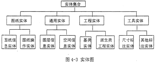 在面向?qū)ο蟮腃AD集成開(kāi)發(fā)系統(tǒng)里,系統(tǒng)數(shù)據(jù)模型的基本元素就是ARX開(kāi)發(fā)語(yǔ)言中的(多是C/C++語(yǔ)言)類(lèi),類(lèi)實(shí)例化后稱(chēng)為對(duì)象或?qū)嶓w,整個(gè)圖紙就是一個(gè)實(shí)體集合,主要由四大塊組成:圖紙實(shí)體集合、通用實(shí)體集合、工程實(shí)體集合和工程實(shí)體集合。其中,圖紙實(shí)體、通用實(shí)體和工具實(shí)體都為獨(dú)立類(lèi),沒(méi)有父類(lèi)或子類(lèi);而工程實(shí)體集合中的各工程實(shí)體是由具有基本特征的基類(lèi)實(shí)體派生而來(lái),具有一個(gè)基類(lèi)和若干個(gè)派生類(lèi),并且各實(shí)體集之間互相獨(dú)立(如圖4-3所示)