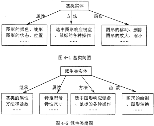對(duì)于以上的問(wèn)題,第一,要對(duì)行業(yè)的需求十分清晰,能夠?qū)π袠I(yè)中涉及到的工程實(shí)體進(jìn)行歸納,要具有“面向?qū)ο蟆钡木幊趟季S;第二,基類(lèi)涉及的屬性方法和函數(shù)基本上與實(shí)體圖形的操作有密切關(guān)系(如圖4-4所示);派生類(lèi)主要涉及到工程實(shí)體的特征屬性、特征方法和特征函數(shù)(如圖4-5示),完整地定義其基類(lèi)和派生類(lèi)是“面向?qū)ο蟮腃AD集成開(kāi)發(fā)系統(tǒng)”中的核心部分;第三,要充分的利用AutoCAD已提供的資源,主要就是要利用AutoCAD系統(tǒng)中的*,dwg文件的圖形文件數(shù)據(jù)庫(kù)中的資源,熟悉各種AutoCAD中實(shí)體(例如點(diǎn)、直線、圓弧等)的DXF碼規(guī)則,并從中提取相關(guān)特征信息;第四,由于在AutoCAD中的.dwg文件中,存儲(chǔ)的是一些簡(jiǎn)單的幾何的點(diǎn)、直線、圓、弧等信息,故還需要另一個(gè)文件去記錄整個(gè)圖紙的工程實(shí)體圖形的邏輯關(guān)系(下一節(jié)詳細(xì)介紹),隨同*.dwg文件的打開(kāi)而打開(kāi),標(biāo)識(shí)*.dwg文件圖形中的實(shí)體圖形邏輯關(guān)系,隨同*.dwg文件的關(guān)閉而記錄*.dwg文件中的實(shí)體圖形邏輯關(guān)系。