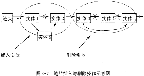 用戶對(duì)實(shí)體進(jìn)行查找、移動(dòng)、旋轉(zhuǎn)、刪除等操作,系統(tǒng)首先要在整個(gè)圖紙中搜索該實(shí)體,因而,系統(tǒng)必須對(duì)整個(gè)圖紙的實(shí)體的綜合信息進(jìn)行存儲(chǔ),多采用鏈?zhǔn)浇Y(jié)構(gòu),設(shè)置一個(gè)鏈頭和一個(gè)指向當(dāng)前實(shí)體的指針。采用鏈?zhǔn)浇Y(jié)構(gòu)的原因是它很方便進(jìn)行查找、插入、刪除,效率高,簡(jiǎn)單明了。(見(jiàn)圖4-7)