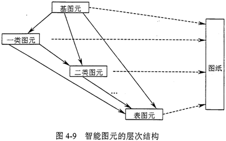 可繼承性:一個智能圖元不僅可以是其他智能圖元的父圖元,也可以是一個或多個智能圖元的子圖元,最底層的智能圖元稱為基圖元,他們沒有父圖元;最上層的智能圖元稱為表圖元,他們沒有子圖元,其集成度最高;就象一個機器的裝配圖由若干個零件圖組成,而一個零件圖是由若干個結構單元組成,整個智能圖元集合屬于一種比較復雜的層次結構,如圖4-9。