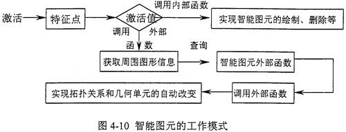 通過對特征點的激活,首先判斷激活值,是調用外部函數(shù)還是調用內部函數(shù),如果是調用內部函數(shù),則根據(jù)激活值,調用某個內部函數(shù),實現(xiàn)智能圖元自身的操作,如刪除、放大、旋轉等等;如果是調用外部函數(shù),則再獲取周圍圖元信息,并以此查詢外部函數(shù)庫,得到某個外部函數(shù),則調用此外部函數(shù),實現(xiàn)智能圖元的拓撲關系和幾何單元信息的改變。(如圖4-11所示)