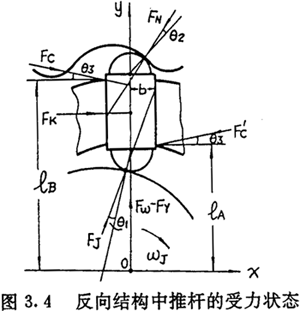 在傳動圈與激波器轉(zhuǎn)向相反的結(jié)構(gòu)中,工作推桿的受力狀誠如圖3.4所示。從受力狀態(tài)圖可以看出,在運動過程中,推桿與導(dǎo)槽必然形成雙側(cè)接觸。推桿兩側(cè)將造成嚴(yán)重磨損,實際生產(chǎn)中,應(yīng)避免使用反向結(jié)構(gòu)。