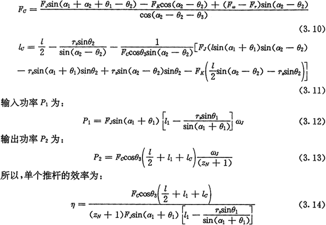 計算時,先根據(jù)輸入功率P1及轉(zhuǎn)速ωJ由(3.19)式計算出FJm,然后對每一工作推桿由式(3.17)計算出FJi,由式(3.10)式及式(3.11)計算出Fci及l(fā)ci,最后代入式(3.21)計算出效率η。