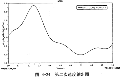 (2)在Adams下建立的樣機模型里,將上述V2(2)速度函數(shù)設(shè)置到第二輸入中,設(shè)置好后,進(jìn)行仿真。得到輸出速度曲線,如圖4-24所示。