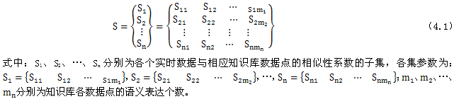 專家系統(tǒng)推理主要是從知識(shí)庫(kù)所需的數(shù)據(jù)集合D={D1、D2、…、Dn}出發(fā),根據(jù)知識(shí)庫(kù)中每一數(shù)據(jù)點(diǎn)相應(yīng)的一個(gè)或多個(gè)語(yǔ)義表達(dá)和數(shù)據(jù)范圍,將獲取實(shí)時(shí)數(shù)據(jù)與知識(shí)庫(kù)中相應(yīng)數(shù)據(jù)的語(yǔ)義表達(dá)和數(shù)據(jù)范圍進(jìn)行相似性分析,得出相似性系數(shù)的集合: