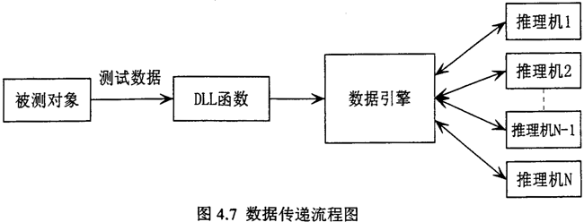 根據(jù)流程圖可知,從故障測(cè)試數(shù)據(jù)到數(shù)據(jù)引擎,有兩種數(shù)據(jù)處理方式,一種是故障測(cè)試數(shù)據(jù)由數(shù)據(jù)采集系統(tǒng)采集后,可先進(jìn)行預(yù)處理,將故障信號(hào)數(shù)據(jù)處理為推理機(jī)所需的故障特征數(shù)據(jù),然后發(fā)送出去,動(dòng)態(tài)連接庫(kù)DLL函數(shù)則通過網(wǎng)絡(luò)接收這些故障特征數(shù)據(jù),同時(shí)對(duì)照推理機(jī)向數(shù)據(jù)引擎申請(qǐng)的故障特征變量,將申請(qǐng)的故障特征變量對(duì)應(yīng)的值找出,按數(shù)據(jù)引擎規(guī)定的格式反送給申請(qǐng)數(shù)據(jù)的推理機(jī)。另一種是故障測(cè)試數(shù)據(jù)由數(shù)據(jù)采集系統(tǒng)采集后,按一定格式直接發(fā)送出去,動(dòng)態(tài)連接庫(kù)DLL函數(shù)則通過網(wǎng)絡(luò)接收這些故障信息數(shù)據(jù),然后再進(jìn)行數(shù)據(jù)預(yù)處理,將故障信息數(shù)據(jù)處理為推理機(jī)所需的故障特征數(shù)據(jù),同時(shí)對(duì)照推理機(jī)向數(shù)據(jù)引擎申請(qǐng)的故障特征變量,將申請(qǐng)的故障特征變量對(duì)應(yīng)的值找出,再按數(shù)據(jù)引擎規(guī)定的格式反送給申請(qǐng)數(shù)據(jù)的推理機(jī)。