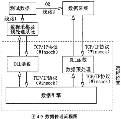 網(wǎng)絡(luò)化遠(yuǎn)程故障診斷的實(shí)現(xiàn),其關(guān)鍵是遠(yuǎn)程數(shù)據(jù)的傳送、存貯及數(shù)據(jù)交換處理。故障診斷系統(tǒng)遠(yuǎn)離故障設(shè)備現(xiàn)場(chǎng),只要故障現(xiàn)場(chǎng)故障測(cè)試數(shù)據(jù)能即時(shí)通過網(wǎng)絡(luò)傳送到故障診斷系統(tǒng)中,故障診斷系統(tǒng)即能實(shí)現(xiàn)網(wǎng)絡(luò)化遠(yuǎn)程故障診斷。當(dāng)智能故障診斷中的推理機(jī)進(jìn)行推理時(shí),通過數(shù)據(jù)引擎向動(dòng)態(tài)連接庫(kù)DLL函數(shù)申請(qǐng)數(shù)據(jù),這些數(shù)據(jù)是推理時(shí)需要的故障特征參數(shù)變量值。動(dòng)態(tài)連接庫(kù)DLL函數(shù)則通過網(wǎng)絡(luò)直接從故障現(xiàn)場(chǎng)測(cè)試采集計(jì)算機(jī)中得到故障信息數(shù)據(jù)。數(shù)據(jù)傳送流程圖如圖4.9 所示。