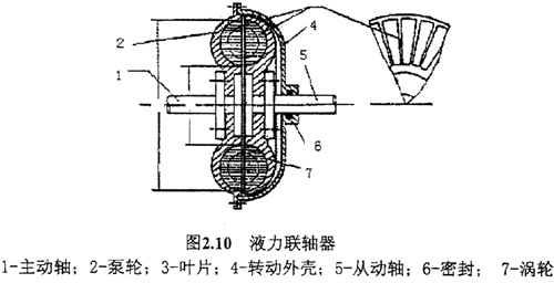 液力聯(lián)軸器中,充有工作油。當原動機通過主動軸帶動泵輪旋轉時,因離心力的作用,工作油在葉片的帶動下由內側(進口)流向外緣(出口),形成高壓高速的液流,高壓高速的液流沖擊渦輪葉片,使渦輪跟著泵輪同向旋轉。工作油在渦輪中,由外緣(進口)流向(內側)出口的過程中減壓減速,然后再流入泵輪的進口。不斷地循環(huán),把工作油的動能和壓力能換成機械功,通過從動軸輸出,帶動工作機器。整個過程實現(xiàn)了從主動軸到從動軸的傳動。